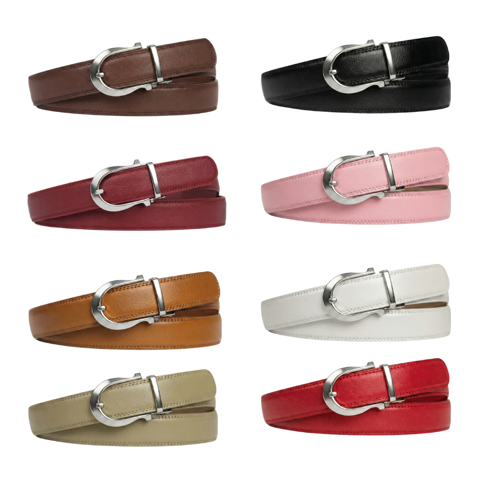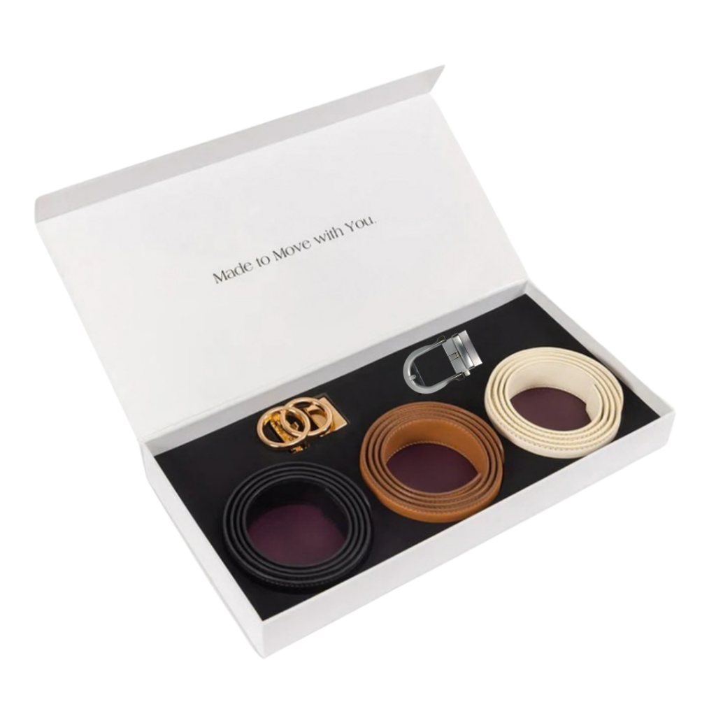 Enfilez votre nouvelle ceinture dans votre pantalon, de droite à gauche. Pour la déverrouiller, poussez l'extrémité située sous la boucle vers l'extérieur.